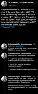 Hours ago, a twitter user, tweeted about his intentions for Lagos road and transportation. With ten tweets under a thread he stated the numbers of cars that drives on Lagos roads everyday, his preference for for mass Transit buses rather than Trains and he also stated three questions he would have to answer if he were to be the Lagos state Governor. His tweet is below: